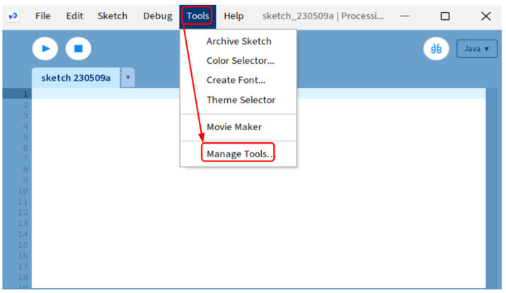 步驟 7 - Processing 直譯器開啟,我們的任務是設定 Python 模式。選擇名為“Tools”的導航,它在列表末尾顯示“Manage Tools”。然後點選“Manage Tools”,將開啟名為“Contribution Manager”的介面。