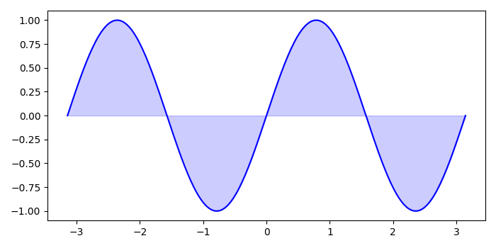 import numpy as np import matplotlib.pyplot as plt plt.rcParams["figure.figsize"] = [7.00, 3.50] plt.rcParams["figure.autolayout"] = True n = 256 X = np.linspace(-np.pi, np.pi, n, endpoint=True) Y = np.sin(2 * X) fig, ax = plt.subplots() ax.plot(X, Y, color='blue', alpha=1.0) ax.fill_between(X, 0, Y, color='blue', alpha=.2) plt.show()