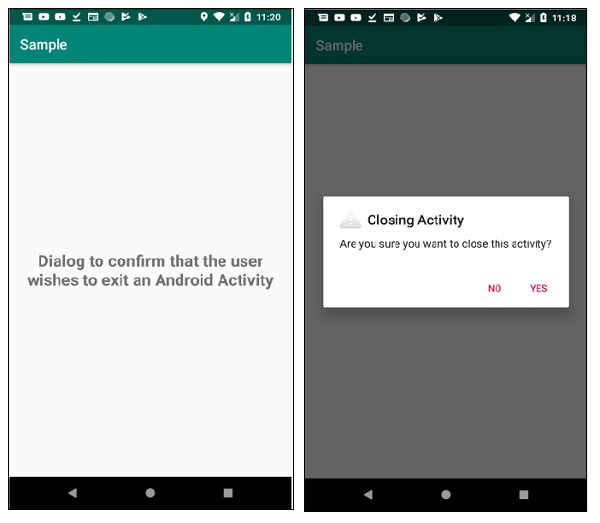 import androidx.appcompat.app.AlertDialog; import androidx.appcompat.app.AppCompatActivity; import android.content.DialogInterface; import android.os.Bundle; import android.widget.Toast; public class MainActivity extends AppCompatActivity { @Override protected void onCreate(Bundle savedInstanceState) { super.onCreate(savedInstanceState); setContentView(R.layout.activity_main); } @Override public void onBackPressed() { newAlertDialog.Builder(this).setIcon(android.R.drawable.ic_dialog_alert) .setTitle("Closing Activity").setMessage("Are you sure you want to closethis activity?") .setPositiveButton("Yes", new DialogInterface.OnClickListener() { @Override public void onClick(DialogInterface dialog, int which) { finish(); Toast.makeText(MainActivity.this, "Activity closed",Toast.LENGTH_SHORT).show(); } }).setNegativeButton("No", null).show(); } }