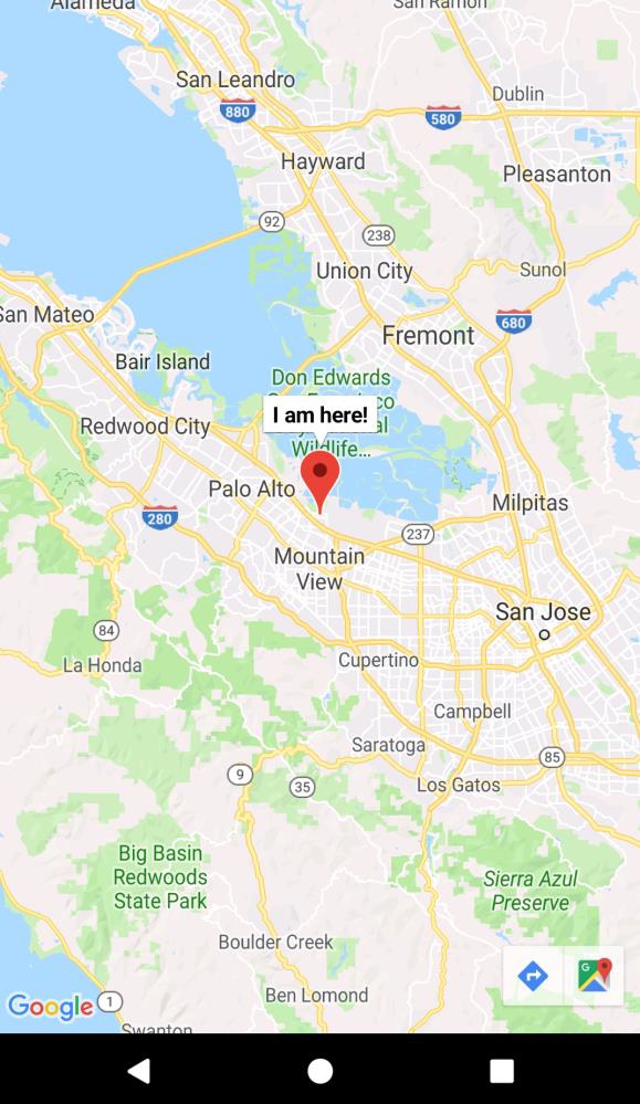 import android.Manifest; import android.content.pm.PackageManager; import android.location.Location; import android.os.Bundle; import android.widget.Toast; import com.google.android.gms.maps.CameraUpdateFactory; import com.google.android.gms.maps.SupportMapFragment; import com.google.android.gms.location.FusedLocationProviderClient; import com.google.android.gms.location.LocationServices; import com.google.android.gms.maps.GoogleMap; import com.google.android.gms.maps.OnMapReadyCallback; import com.google.android.gms.maps.model.LatLng; import com.google.android.gms.maps.model.MarkerOptions; import com.google.android.gms.tasks.OnSuccessListener; import com.google.android.gms.tasks.Task; import androidx.annotation.NonNull; import androidx.core.app.ActivityCompat; import androidx.fragment.app.FragmentActivity; public class MainActivity extends FragmentActivity implements OnMapReadyCallback { Location currentLocation; FusedLocationProviderClient fusedLocationProviderClient; private static final int REQUEST_CODE = 101 @Override protected void onCreate(Bundle savedInstanceState) { super.onCreate(savedInstanceState); setContentView(R.layout.activity_main); fusedLocationProviderClient = LocationServices.getFusedLocationProviderClient(this); fetchLocation(); } private void fetchLocation() { if (ActivityCompat.checkSelfPermission( this, Manifest.permission.ACCESS_FINE_LOCATION) != PackageManager.PERMISSION_GRANTED && ActivityCompat.checkSelfPermission( this, Manifest.permission.ACCESS_COARSE_LOCATION) != PackageManager.PERMISSION_GRANTED) { ActivityCompat.requestPermissions(this, new String[]{Manifest.permission.ACCESS_FINE_LOCATION}, REQUEST_CODE); return; } Task<Location> task = fusedLocationProviderClient.getLastLocation(); task.addOnSuccessListener(new OnSuccessListener<Location>() { @Override public void onSuccess(Location location) { if (location != null) { currentLocation = location; Toast.makeText(getApplicationContext(), currentLocation.getLatitude() + "" + currentLocation.getLongitude(), Toast.LENGTH_SHORT).show(); SupportMapFragment supportMapFragment = (SupportMapFragment) getSupportFragmentManager().findFragmentById(R.id.myMap); assert supportMapFragment != null; supportMapFragment.getMapAsync(MainActivity.this); } } }); } @Override public void onMapReady(GoogleMap googleMap) { LatLng latLng = new LatLng(currentLocation.getLatitude(), currentLocation.getLongitude()); MarkerOptions markerOptions = new MarkerOptions().position(latLng).title("I am here!"); googleMap.animateCamera(CameraUpdateFactory.newLatLng(latLng)); googleMap.animateCamera(CameraUpdateFactory.newLatLngZoom(latLng, 5)); googleMap.addMarker(markerOptions); } @Override public void onRequestPermissionsResult(int requestCode, @NonNull String[] permissions, @NonNull int[] grantResults) { switch (requestCode) { case REQUEST_CODE: if (grantResults.length > 0 && grantResults[0] == PackageManager.PERMISSION_GRANTED) { fetchLocation(); } break; } } }