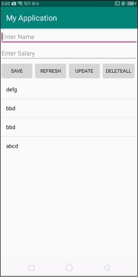 在上面的程式碼中,我們使用了姓名和薪水作為編輯文字,當用戶點選儲存按鈕時,它會將資料儲存到 sqlite 資料庫中。插入值後,點選重新整理按鈕以**以降序**更新來自遊標的列表檢視。如果使用者點選更新按鈕,它將更新資料。