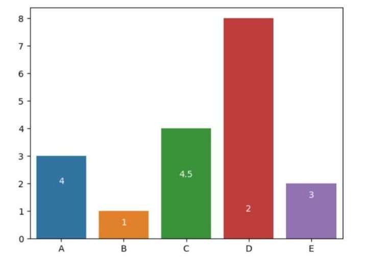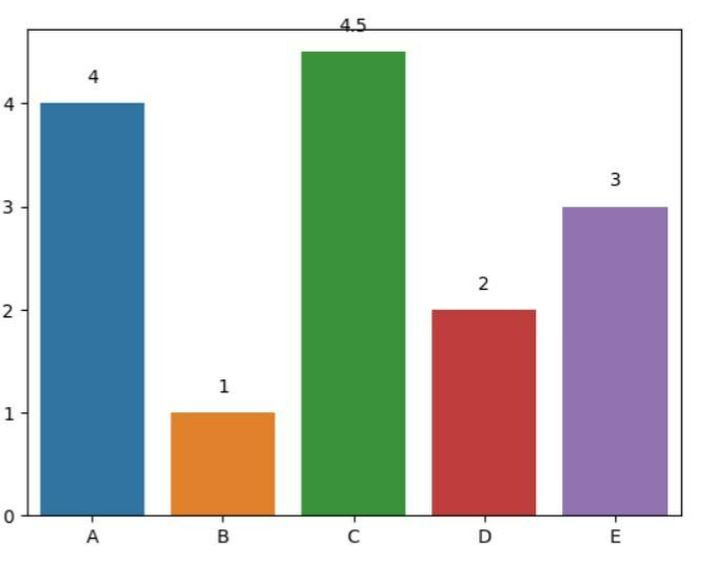 # Show values above bars import seaborn as sns import matplotlib.pyplot as plt # Data x_ax = ['A', 'B', 'C', 'D', 'E'] y_ax = [4, 1, 4.5, 2, 3] # Create a barplot ax = sns.barplot(x=x_ax, y=y_ax) # Add values above bars for i, v in enumerate(y): ax.text(i, v + 0.2, str(v), ha='center') plt.show()