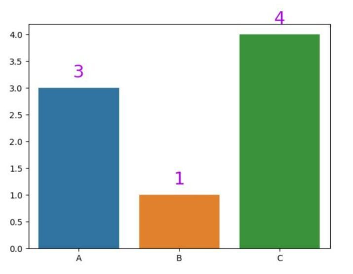 # Show values with custom color and font size import seaborn as sns import matplotlib.pyplot as plt # Data x_axes = ['A', 'B', 'C'] y_axes = [3, 1, 4] # Create a barplot ax = sns.barplot(x=x_axes, y=y_axes) # Add values with custom color and font size for i, v in enumerate(y): ax.text(i, v + 0.2, str(v), ha='center', color='#ab09eb', fontsize=21) plt.show()