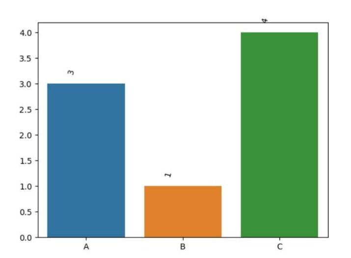 #Show values with custom position and rotation import seaborn as sns import matplotlib.pyplot as plt # Data x = ['A', 'B', 'C'] y = [3, 1, 4] # Create a barplot ax = sns.barplot(x=x, y=y) # Add values with custom position and rotation for i, v in enumerate(y): ax.text(i - 0.15, v + 0.2, str(v), ha='center', rotation=45) plt.show()