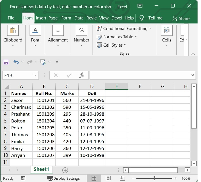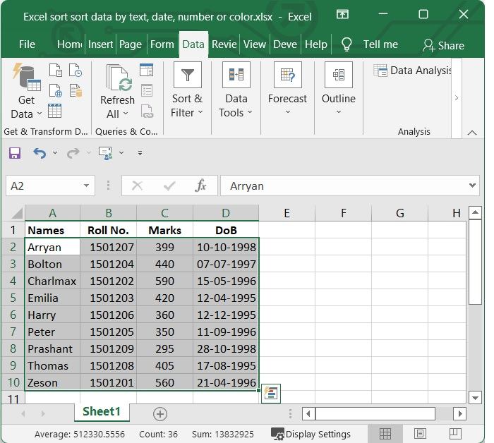 在上面的示例中,假設我們想按學生的分數對資料進行排序。請按照以下步驟操作。
