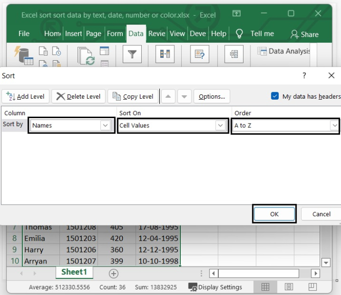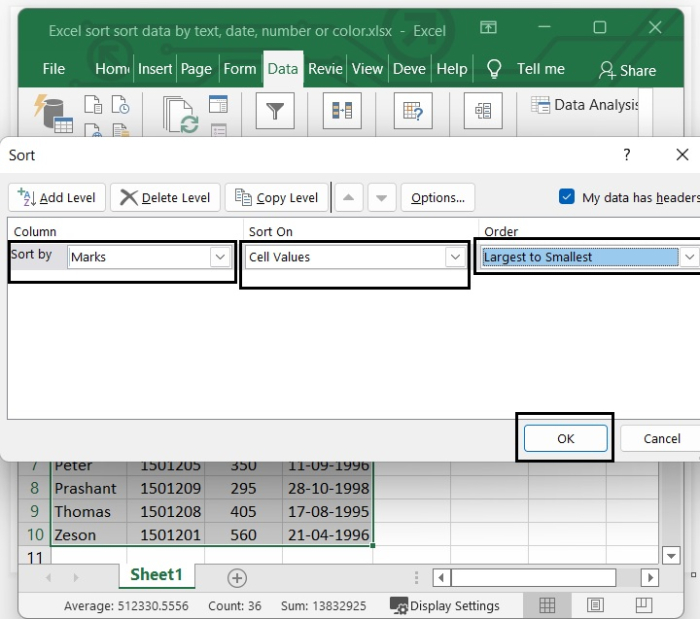 在“排序”對話方塊的“列”部分中選擇寫入數字的列名。這將導致資料按所需順序排序。然後,在標題為“排序依據”的部分下,選擇標記為“單元格值”的選項進行排序。在標有“順序”的框中指示應執行排序的順序。下一步是單擊“確定”按鈕。