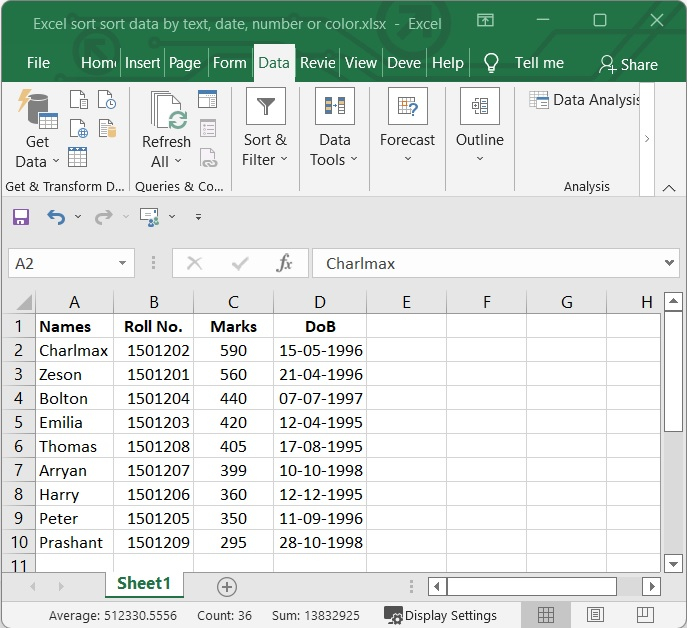 在繼續之前,選擇要排序的資料範圍。之後,選擇Excel中的“資料”選項卡,然後轉到“排序”選單。請檢視下面的螢幕截圖。