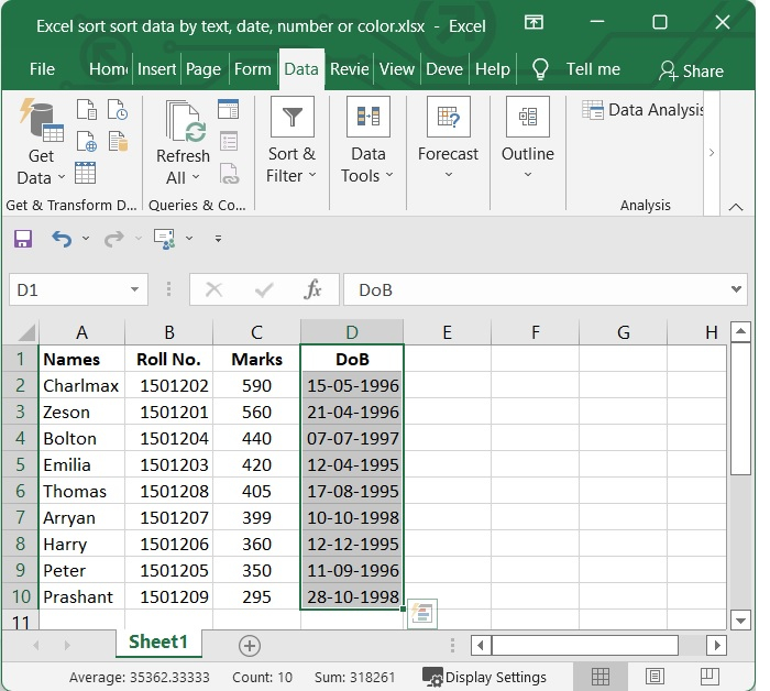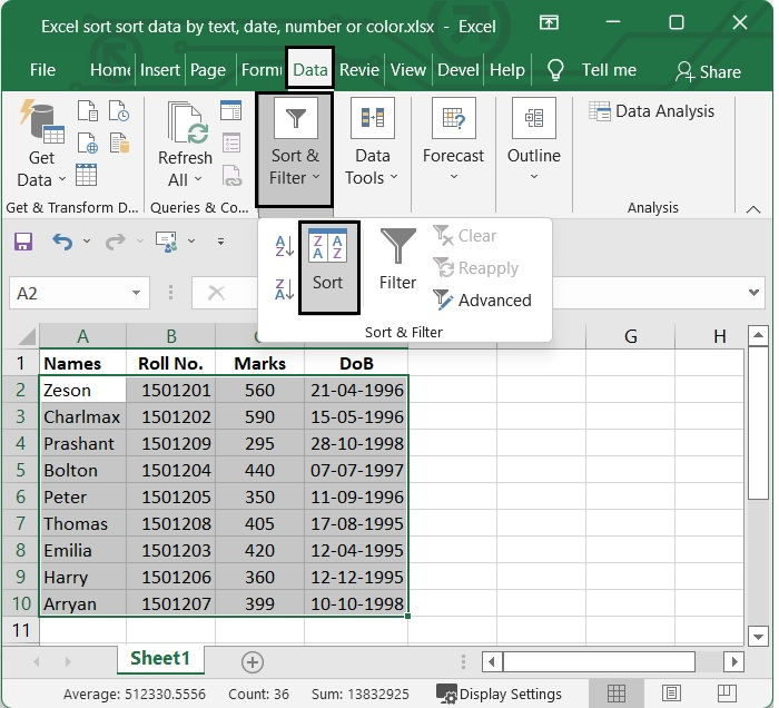 之後,選擇要排序的資料範圍。之後,選擇Excel中的“資料”選項卡,然後轉到“排序”選單。請檢視下面給出的螢幕截圖。