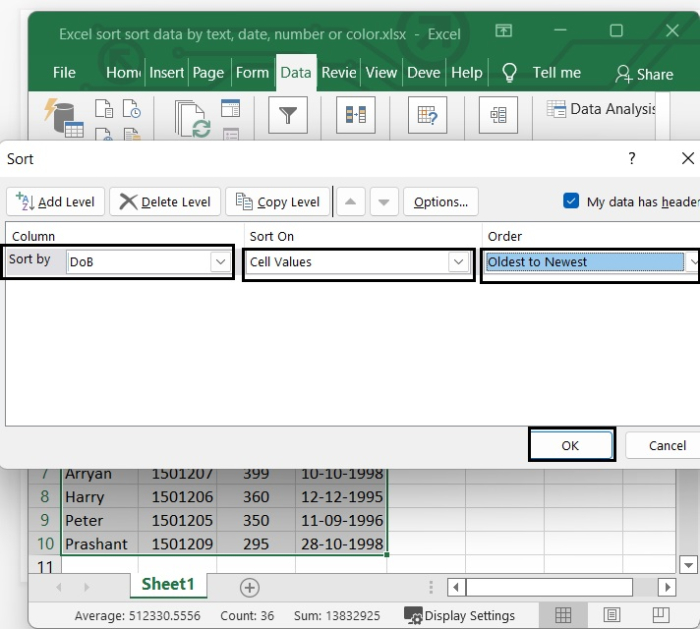 在我們的示例中,選擇的列名為DoB,順序為“從舊到新”。