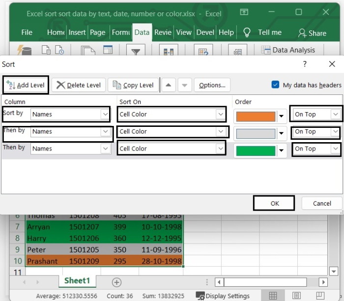 在“列”部分中,選擇“姓名”或其他包含彩色單元格的列之一。然後在“排序依據”部分下選擇“單元格顏色”選項。然後,在“順序”部分中選擇要放在頂部或底部的單元格顏色。