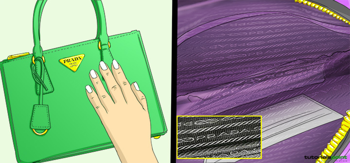 步驟1 - 小牛皮手袋必須觸感光滑。內飾應採用優質材料製成,並應具有標準的普拉達圖案。內襯面料必須由納帕皮革或尼龍面料製成。正品普拉達包的針腳應小而牢固。在皮革普拉達包上,針腳應與皮革顏色一致。