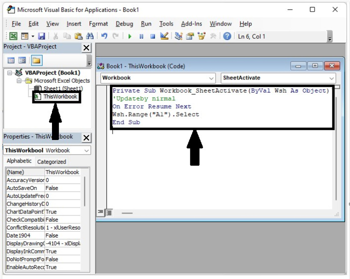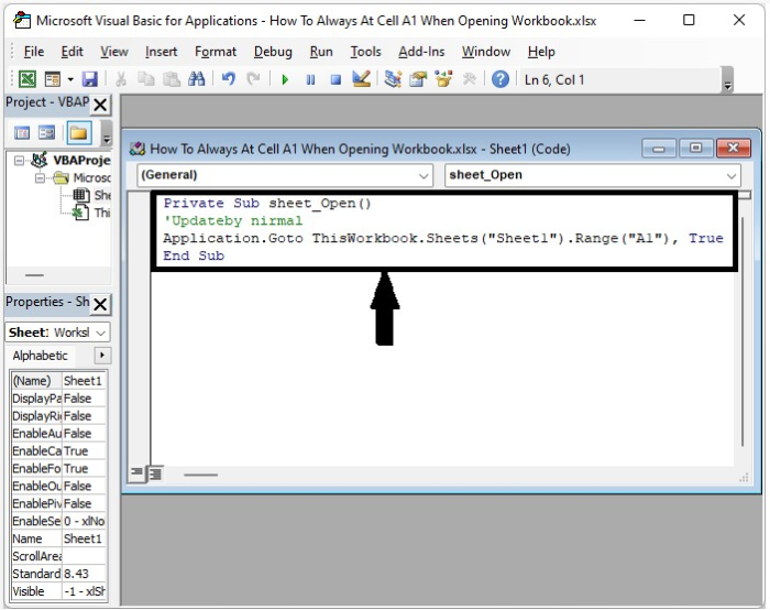本教程將幫助您瞭解我們如何始終在單元格 A1 開啟工作簿。這裡我們將有兩個部分:首先,程式碼將適用於整個工作簿,第二部分將僅適用於工作簿中的指定工作表。