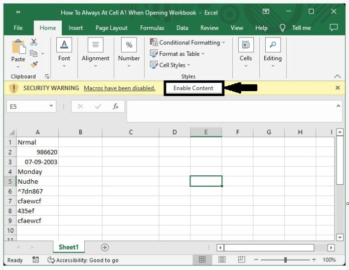 現在關閉 VBA 並透過點選“檔案為 VBA 啟用”儲存 Excel 表格。開啟表格並點選“啟用程式碼”以從單元格 A1 開始。