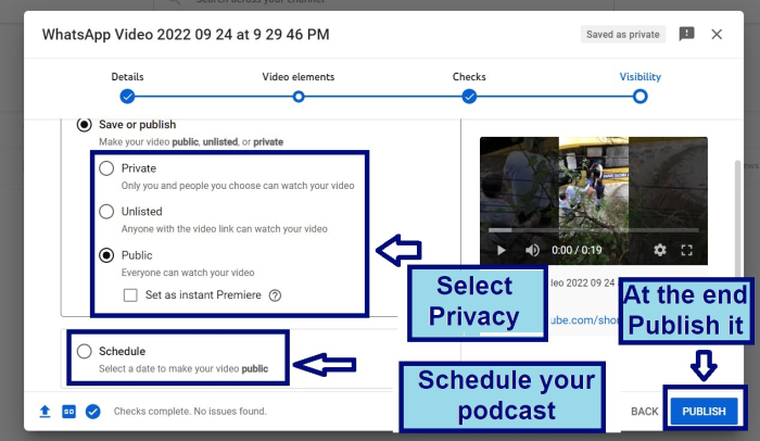 步驟5 - 選擇隱私設定。現在是時候釋出您的影片了。您可以立即上傳它,也可以安排稍後釋出它。最後點選“釋出”。