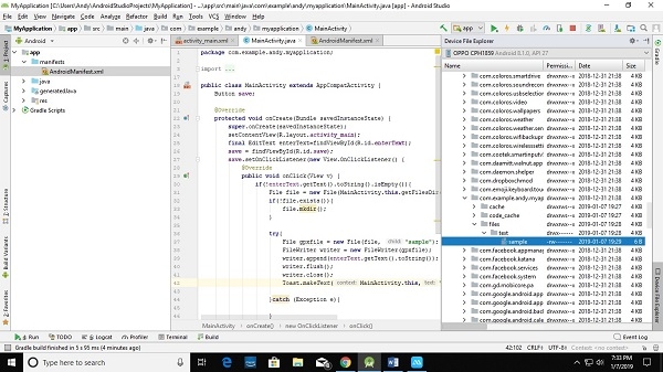 要驗證以上結果,請檢視/data/data/<your.package.name>/files/text/sample.txt,如下所示 -