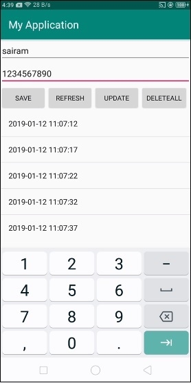 在上面的程式碼中,我們使用了名稱和工資作為編輯文字,當用戶點選儲存按鈕時,它會將資料儲存到 SQLite 資料庫中。插入值後,點選重新整理按鈕以使用預設時間更新列表檢視。如果使用者點選更新按鈕,它將更新資料。