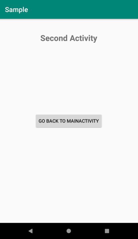 activity_second.xml: <?xml version="1.0" encoding="utf-8"?> <RelativeLayout xmlns:android="http://schemas.android.com/apk/res/android" xmlns:tools="http://schemas.android.com/tools" android:layout_width="match_parent" android:layout_height="match_parent" tools:context=".MainActivity"> <TextView android:text="Second Activity" android:textSize="24sp" android:textStyle="bold" android:layout_width="wrap_content" android:layout_height="wrap_content" android:layout_centerHorizontal="true" android:layout_marginTop="40dp"/> <Button android:id="@+id/btnOpenMain" android:text="Go back to MainActivity" android:layout_width="wrap_content" android:layout_height="wrap_content" android:layout_centerInParent="true"/> </RelativeLayout>