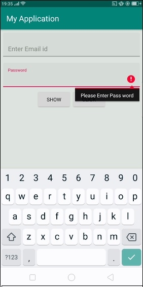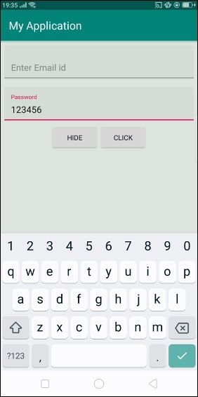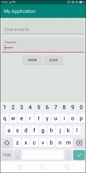<?xml version = "1.0" encoding = "utf-8"?> <LinearLayout xmlns:android = "http://schemas.android.com/apk/res/android" xmlns:tools = "http://schemas.android.com/tools" android:layout_width = "match_parent" android:layout_height = "match_parent" tools:context = ".MainActivity" android:background = "#dde4dd" android:orientation = "vertical"> <android.support.design.widget.TextInputLayout android:layout_width = "match_parent" android:layout_height = "wrap_content" android:id = "@+id/layoutEmail" android:layout_marginTop = "8dp" android:layout_marginStart = "8dp" android:layout_marginEnd = "8dp" style = "@style/Widget.MaterialComponents.TextInputLayout.FilledBox"> <android.support.design.widget.TextInputEditText android:layout_width = "match_parent" android:layout_height = "wrap_content" android:id = "@+id/email" android:hint = "Enter Email id" android:inputType = "textEmailAddress"/> </android.support.design.widget.TextInputLayout> <android.support.design.widget.TextInputLayout android:layout_width = "match_parent" android:layout_height = "wrap_content" android:id = "@+id/layoutPassword" android:layout_marginTop = "8dp" android:layout_marginStart = "8dp" android:layout_marginEnd = "8dp" style = "@style/Widget.MaterialComponents.TextInputLayout.FilledBox"> <android.support.design.widget.TextInputEditText android:layout_width = "match_parent" android:layout_height = "wrap_content" android:id = "@+id/password" android:hint = "Password" android:inputType = "textPassword"/> </android.support.design.widget.TextInputLayout> <LinearLayout android:layout_width = "match_parent" android:gravity = "center" android:layout_height = "wrap_content"> <Button android:id = "@+id/passwordVisible" android:layout_width = "wrap_content" android:layout_height = "wrap_content" android:text = "Show"></Button> <Button android:id = "@+id/click" android:layout_width = "wrap_content" android:layout_height = "wrap_content" android:text = "Click"></Button> </LinearLayout> </LinearLayout>