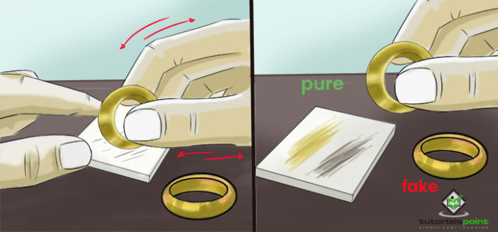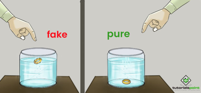 這是區分真金和假金的最簡單方法。取一杯水,將黃金製品放入其中。如果是真金,由於其重量,它會沉到底部。另一方面,如果黃金是鍍金或人造的,它會漂浮在水面上。但是,此測試無法用於測試黃金的純度。