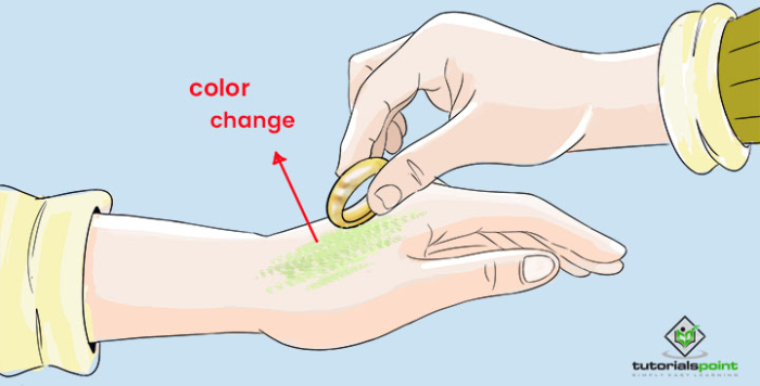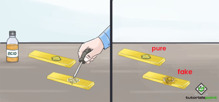 將黃金製品握在手中,用小針在表面輕輕刮擦一小塊。現在取下測試套件中的滴管,用它將少量酸注入刮擦的表面。仔細觀察刮擦表面與酸反應後的顏色變化,然後將顏色與測試套件中提供的色卡進行匹配,以找出用作合金的金屬是什麼以及黃金的純度是多少。