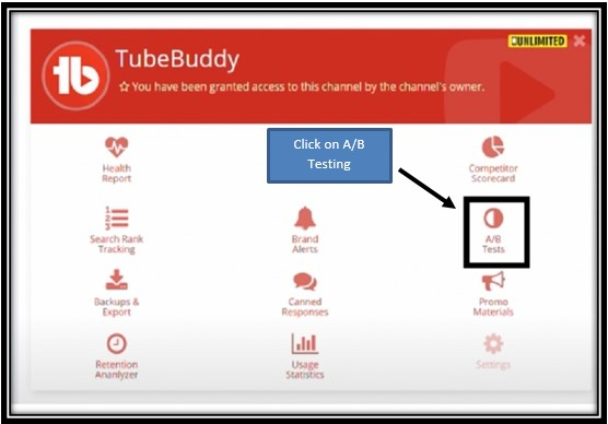 步驟 2 - 在 Tubebuddy.com 網站的主頁上,點選 A/B 測試(如下所示)。