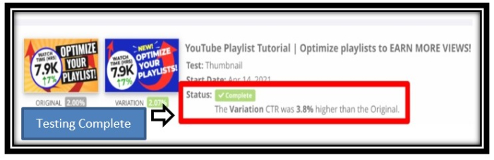 此外,它將獲得關鍵資料,因為它會更改你的縮圖。那麼這在現實世界中是如何體現的呢?你可以看到,我們對影片“YouTube 播放列表教程 | 最佳化播放列表以獲得更多觀看量!”的縮圖進行了 A/B 測試,如下所示。
