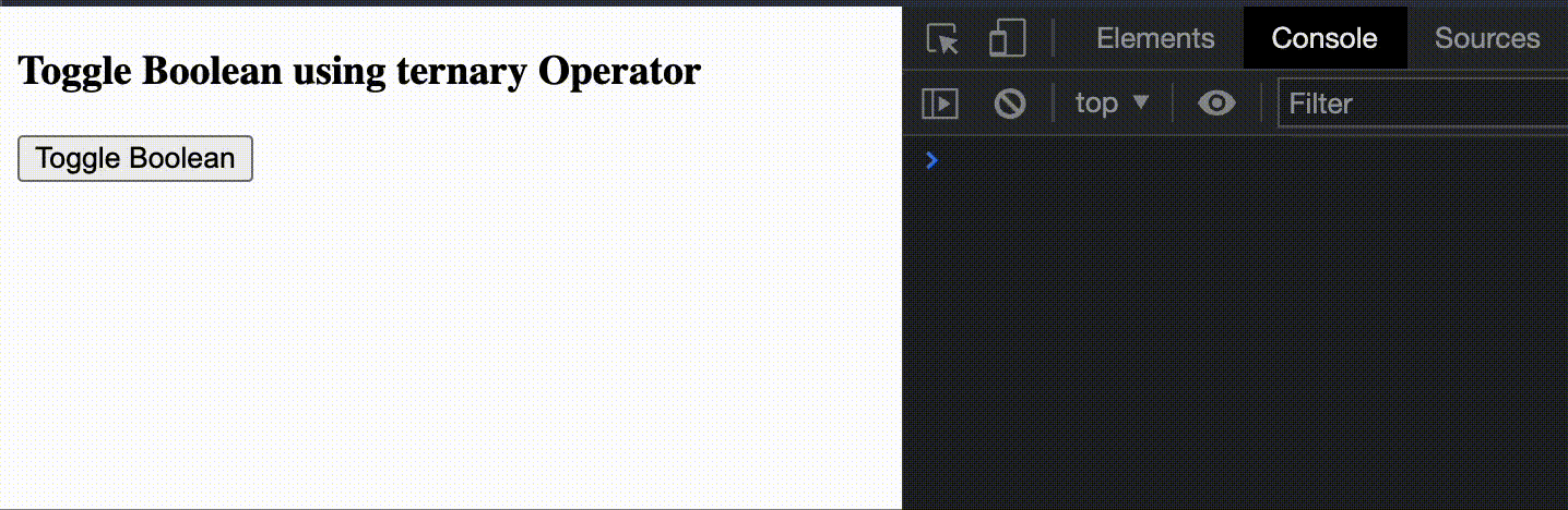 <html> <head> <title>How to toggle a boolean using JavaScript?</title> <script> function toggleBoolean() { let flag = true; console.log(flag); flag = flag ? false : true; // Toggling the boolean console.log(flag); } </script> </head> <body> <h3>Toggle Boolean using ternary Operator</h3> <button onclick="toggleBoolean()">Toggle Boolean</button> </body> </html>