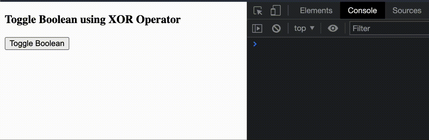 <html> <head> <title>How to toggle a boolean using JavaScript?</title> <script> function toggleBoolean() { let flag = true; console.log(flag); flag = flag ^ true; // Toggling the boolean console.log(flag ? true : false); } </script> </head> <body> <h3>Toggle Boolean using XOR Operator</h3> <button onclick="toggleBoolean()">Toggle Boolean</button> </body> </html>