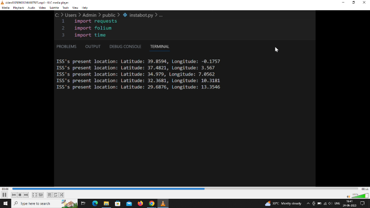 終端顯示的輸出將以經緯度格式顯示ISS的當前位置。
