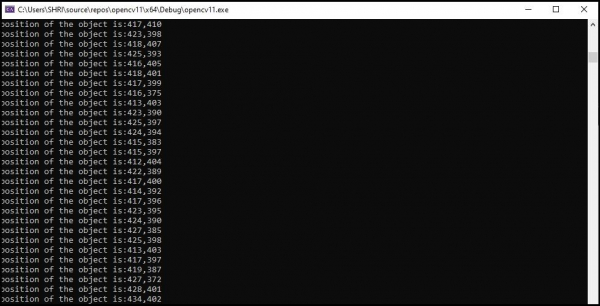 cout << "position of the object is:" << Horizontal_Last << "," << vertical_Last << endl;//showing tracked co-ordinated values//
