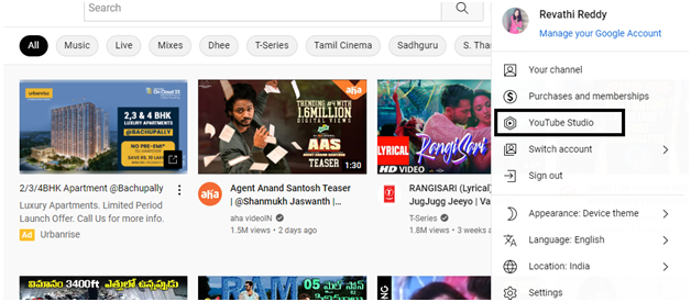 - 步驟 2 − 從下拉選單中點選YouTube Studio(如下所示)。