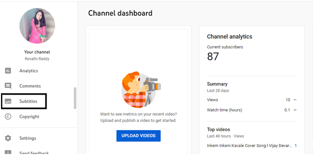 - 步驟 3 − 您將進入此頁面(如下所示),並顯示頻道資訊面板。向下滾動,然後從左側選單中選擇字幕並點選它。