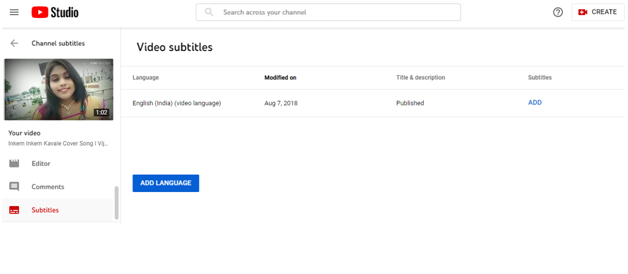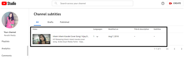 - 步驟 4 − 您將進入頻道字幕頁面(如下所示),並選擇要新增字幕的影片。這裡我只有一個影片,所以我正在為這個影片新增字幕。