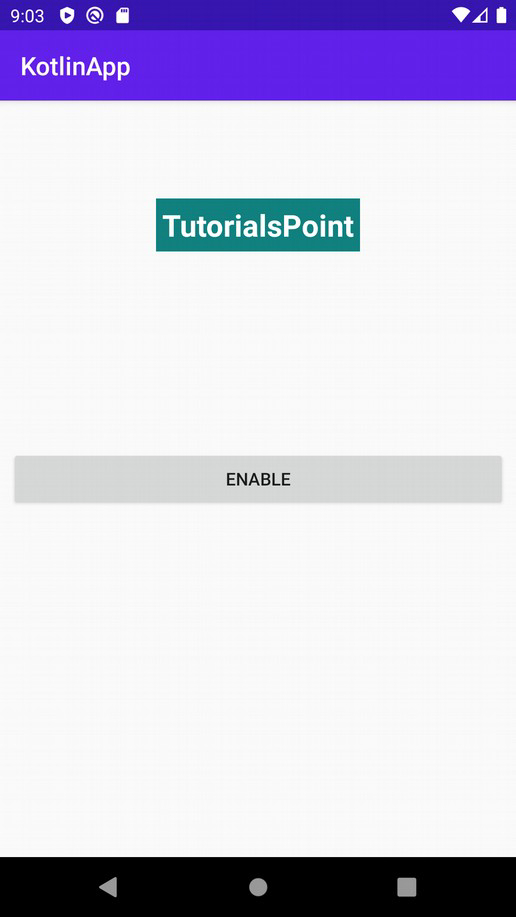 <?xml version="1.0" encoding="utf-8"?> <RelativeLayout xmlns:android="http://schemas.android.com/apk/res/android" android:layout_width="match_parent" android:layout_height="match_parent" android:layout_margin="8dp"> <TextView android:id="@+id/textView" android:layout_width="wrap_content" android:layout_height="wrap_content" android:layout_centerHorizontal="true" android:layout_marginTop="70dp" android:background="#008080" android:padding="5dp" android:text="TutorialsPoint" android:textColor="#fff" android:textSize="24sp" android:textStyle="bold" /> <LinearLayout android:layout_width="match_parent" android:layout_height="wrap_content" android:layout_centerInParent="true" android:orientation="horizontal"> <Button android:id="@+id/btnEnable" android:layout_width="0dp" android:layout_height="wrap_content" android:layout_weight="1" android:onClick="enablePhone" android:text="Enable" /> <Button android:id="@+id/btnLock" android:layout_width="0dp" android:layout_height="wrap_content" android:layout_weight="1" android:onClick="lockPhone" android:text="Lock" /> </LinearLayout> </RelativeLayout>