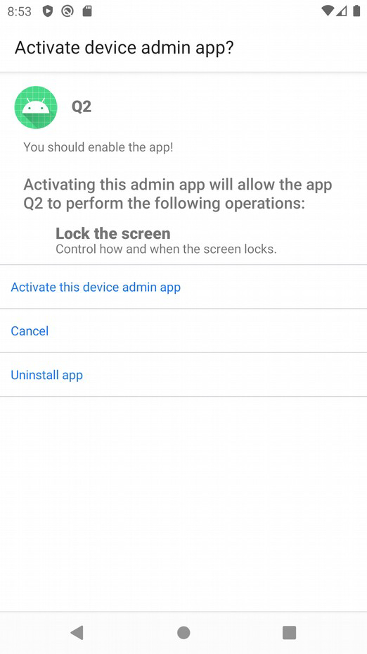 <?xml version="1.0" encoding="utf-8"?> <manifest xmlns:android="http://schemas.android.com/apk/res/android" package="com.example.q2"> <application android:allowBackup="true" android:icon="@mipmap/ic_launcher" android:label="@string/app_name" android:roundIcon="@mipmap/ic_launcher_round" android:supportsRtl="true" android:theme="@style/AppTheme"> <activity android:name=".MainActivity"> <intent-filter> <action android:name="android.intent.action.MAIN" /> <category android:name="android.intent.category.LAUNCHER" /> </intent-filter> </activity> <receiver android:name=".DeviceAdmin" android:permission="android.permission.BIND_DEVICE_ADMIN" > <meta-data android:name= "android.app.device_admin" android:resource= "@xml/policies" /> <intent-filter> <action android:name= "android.app.action.DEVICE_ADMIN_ENABLED" /> </intent-filter> </receiver> </application> </manifest>