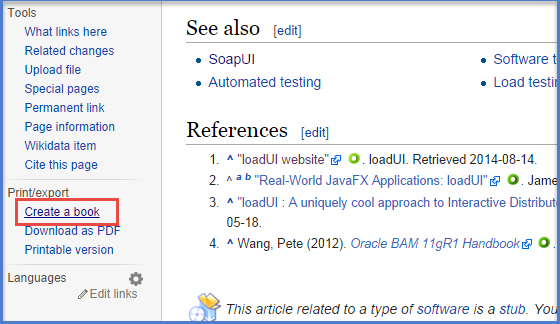 在維基百科中收集所需資料,轉到維基百科頁面左側的“列印/匯出”選項,然後點選“建立書籍”連結。如下圖所示: