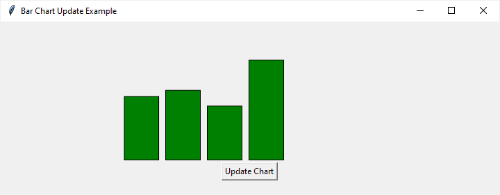 在此示例中,update_chart 函式遍歷每個條形,使用隨機值更新其高度。然後,canvas.itemconfig 方法用於將每個條形更改為綠色。