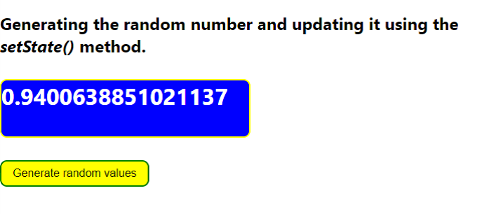 import React, { Component } from "react"; // creating the class component class App extends Component { state = { number: Math.random(), }; // Method to update the object changeNumber = () => { this.setState({ number: Math.random() }); }; render() { return ( <div> <h2> {" "} Generating the random number and updating it using the{" "} <i> setState() </i> method.{" "} </h2> <h3 style={{ border: "2px solid yellow", borderRadius: "10px", width: "22rem", height: "5rem", backgroundColor: "blue", color: "white", fontSize: "2rem", }} > <span>{this.state.number}</span> </h3> <button onClick= {this.changeNumber} style = {{ border: "2px solid green", borderRadius: "10px", padding: "0.5rem 1rem", backgroundColor: "yellow", color: "black", fontSize: "1rem", }} > {" "} Generate random values{" "} </button> </div> ); } } export default App;