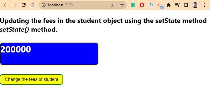 之後,每當使用者按下按鈕時,它都會呼叫 changesFees() 函式,該函式只更改 student 物件中 fee 屬性的值。使用者可以看到我們如何在 setState() 方法內部使用擴充套件運算子來保持 student 物件中的其他值不變。