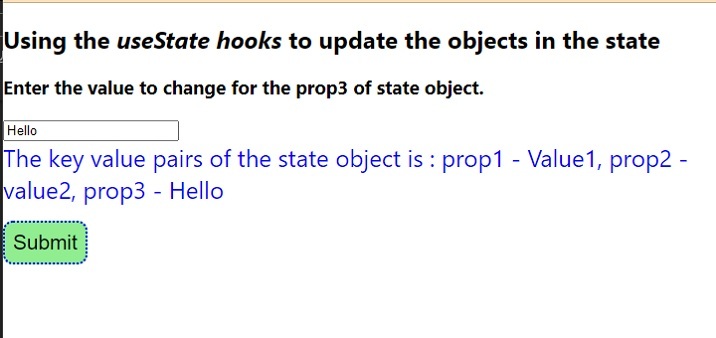 import React, { useState } from "react"; const App = () => { const [state, setState] = useState({ prop1: "Value1", prop2: "value2", prop3: "value3", }); const [value, setValue] = useState(""); function handleValue(e) { // handle the value let new_value = e.target.value; setValue(new_value); } function handleSubmit() { // updating the state object setState((state) => ({ ...state, prop3: value })); } return ( <div> <h2> {" "} Using the <i> useState hooks </i> to update the objects in the state </h2> <h3>Enter the value to change for the prop3 of state object. </h3> <input type = "text" value = {value} onChange = {handleValue} /> <div style = {{ color: "blue", fontSize: "1.5rem" }}> The key value pairs of the state object are : prop1 - {state.prop1}, prop2 - {state.prop2}, prop3 - {state.prop3} </div> <button onClick = {handleSubmit} style = {{ margin: "1rem 0", padding: "0.5rem 1rem", backgroundColor: "lightgreen", border: "2px dotted blue", borderRadius: "10px", color: "black", fontSize: "1.3rem", padding: "0.5rem", }} > Submit </button> </div> ); }; export default App;