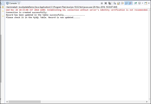 import java.sql.DriverManager; import java.sql.ResultSet; import java.sql.SQLException; import com.mysql.jdbc.Connection; import com.mysql.jdbc.PreparedStatement; import com.mysql.jdbc.Statement; public class JavaUpdateDemo { public static void main(String[] args) { Connection conn = null; Statement stmt = null; try { try { Class.forName("com.mysql.jdbc.Driver"); } catch (Exception e) { System.out.println(e); } conn = (Connection) DriverManager.getConnection("jdbc:mysql:///business", "Manish", "123456"); System.out.println("Connection is created successfully:"); stmt = (Statement) conn.createStatement(); String query1 = "update UpdateDemo set Name='Johnson' " + "where id in(1,4)"; stmt.executeUpdate(query1); System.out.println("Record has been updated in the table successfully.................."); } catch (SQLException excep) { excep.printStackTrace(); } catch (Exception excep) { excep.printStackTrace(); } finally { try { if (stmt != null) conn.close(); } catch (SQLException se) {} try { if (conn != null) conn.close(); } catch (SQLException se) { se.printStackTrace(); } } System.out.println("Please check it in the MySQL Table. Record is now updated......."); } }
