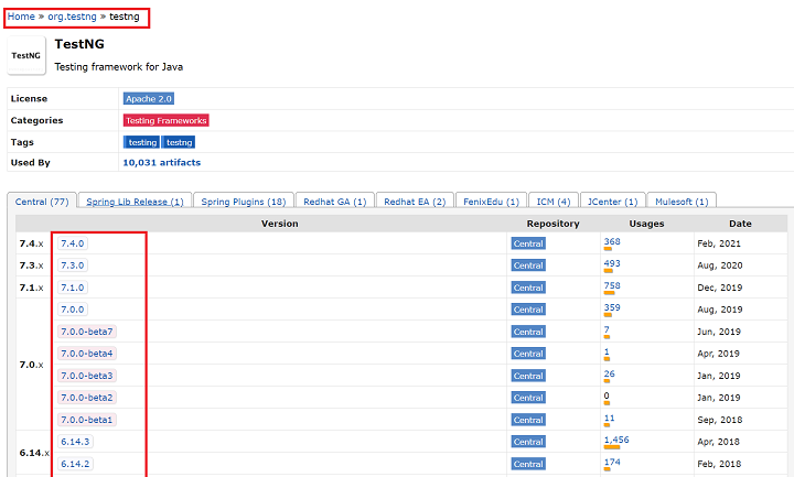 現在,點選 TestNG。它顯示了所有可供下載的版本。然後,點選最新版本或任何特定版本進行下載,如下面的螢幕截圖所示