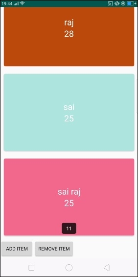 }在上面的程式碼中,我們基於size-1刪除資料,這意味著它將從底部刪除資料。刪除資料後,我們使用notifyDataSetChanged()更新介面卡。