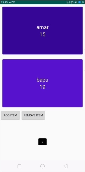 }在上面的程式碼中,我們添加了RecyclerView和studentAdapter。在studentAdapter中,我們傳遞了studentDataList作為ArrayList。StudentDataList包含學生姓名和年齡。我們添加了兩個按鈕:新增和刪除。使用新增按鈕,我們可以向ArrayList新增專案,如下所示: