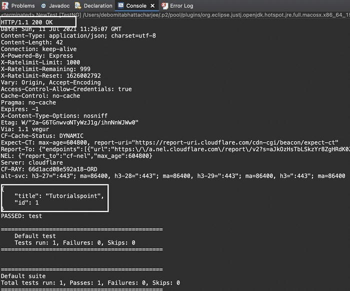 使用 Rest Assured,我們將把標題域的值從 sunt aut facere repellat provident occaecati excepturi optio reprehenderit 更新為 Tutorialspoint。
