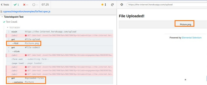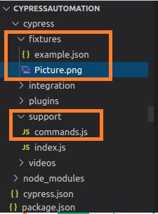 安裝完成後,我們必須在 command.js 檔案中新增語句 import 'cypress-fileupload' ,該檔案位於 Cypress 專案的 support 資料夾中。此外,我們還應在 fixtures 資料夾(Picture.png 檔案)中新增我們要上傳的檔案。