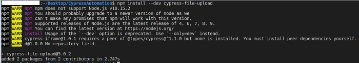 我們可以在 Cypress 中上傳檔案。要在 Cypress 中執行檔案上傳任務,我們必須首先使用命令安裝一個外掛 −