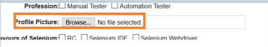 import org.openqa.selenium.By; import org.openqa.selenium.WebDriver; import org.openqa.selenium.WebElement; import org.openqa.selenium.chrome.ChromeDriver; import java.util.concurrent.TimeUnit; public class FileUpload{ public static void main(String[] args) { System.setProperty("webdriver.chrome.driver","C:\Users\ghs6kor\Desktop\Java\chromedriver.exe"); WebDriver driver = new ChromeDriver(); String u = "https://tutorialspoint.tw/selenium/selenium_automation_practice.htm"; driver.get(u); driver.manage().timeouts().implicitlyWait(6, TimeUnit.SECONDS); // identify element WebElement m=driver.findElement(By.xpath("//input[@name='photo']")); // file selection field with file path m.sendKeys("C:\Users\ghs6kor\Tulips.jpg"); } }