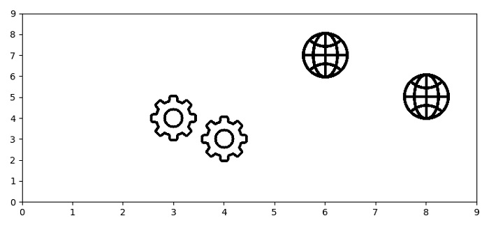 import matplotlib.pyplot as plt from matplotlib.offsetbox import OffsetImage, AnnotationBbox plt.rcParams["figure.figsize"] = [7.50, 3.50] plt.rcParams["figure.autolayout"] = True def getImage(path): return OffsetImage(plt.imread(path, format="jpg"), zoom=.1) paths = ['globe.jpg', 'settings.jpg', 'settings.jpg', 'globe.jpg'] x = [8, 4, 3, 6] y = [5, 3, 4, 7] fig, ax = plt.subplots() for x0, y0, path in zip(x, y, paths): ab = AnnotationBbox(getImage(path), (x0, y0), frameon=False) ax.add_artist(ab) plt.xticks(range(10)) plt.yticks(range(10)) plt.show()