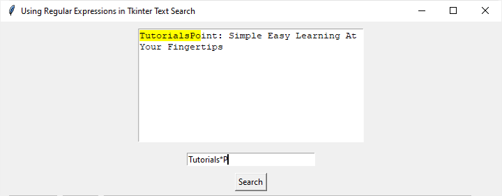 在此示例中,我們有一個 Tkinter 視窗,其中包含一個 Text 小部件、一個用於搜尋模式的 Entry 小部件和一個 Search 按鈕。當用戶單擊 Search 按鈕時,將觸發 search_text 函式。它從 Entry 小部件檢索搜尋模式,使用 Text 小部件的 search 方法執行正則表示式搜尋,並透過應用帶有黃色背景的“found”標籤來突出顯示匹配的文字。